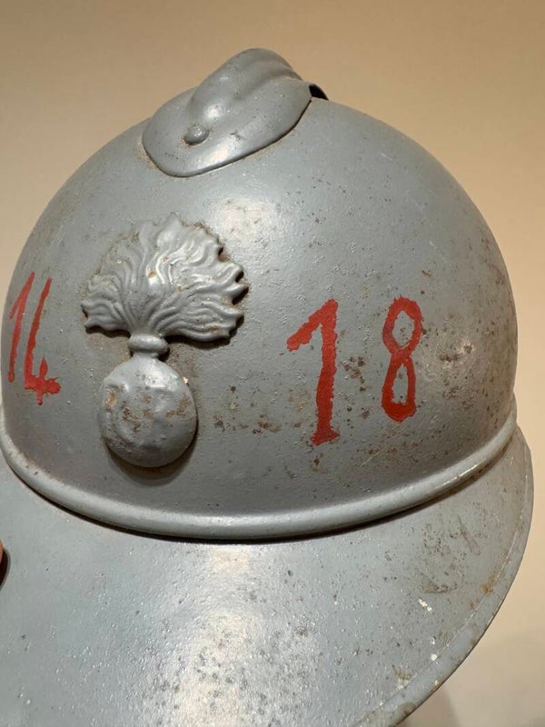 De helm is nadien herschilderd geweest voor als souvenier te houden met het opschrift 14/18 als herdenking aan de oorlog.