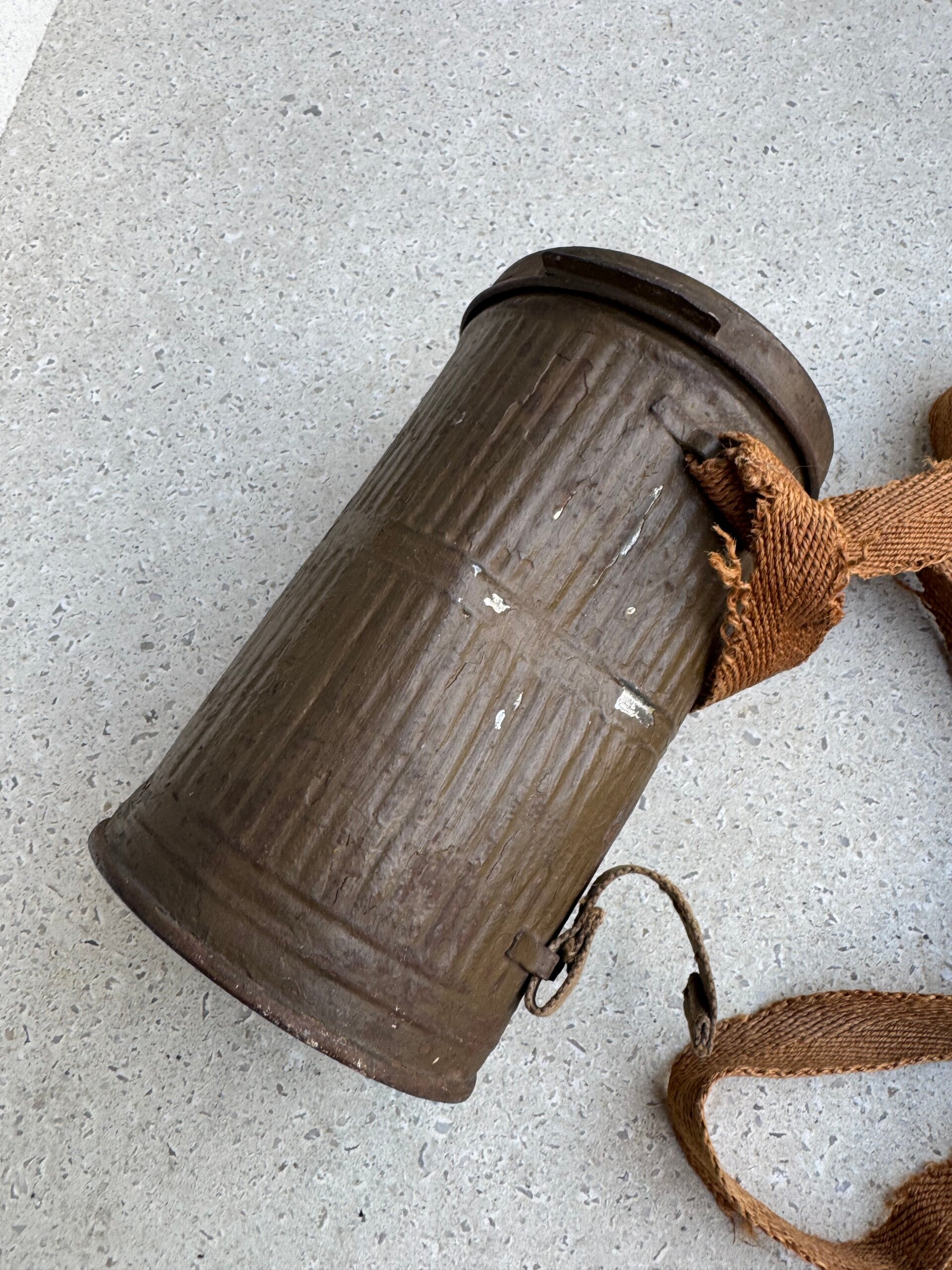 Gasmasker compleet met alle riemen, gasmaskerbus heeft een deuk.